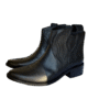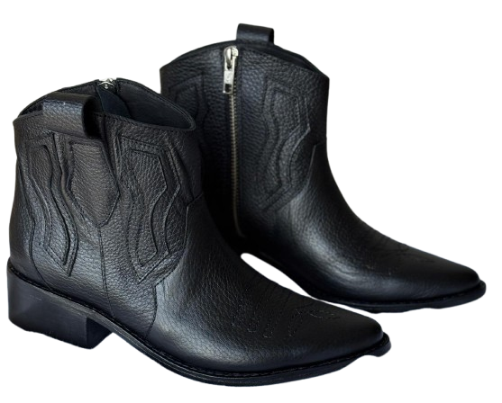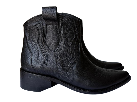 Bota de cuero color negro , de caña corta , con dibujos en hilo en laterales, cierre metalico, taco de 4 cm de alto. Super comodas para un andar liviano.