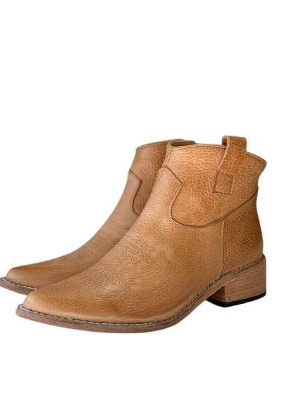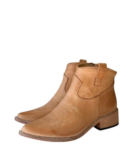 Bota de cuero color caramelo caña corta , cierre metalico , taco de 4 cm